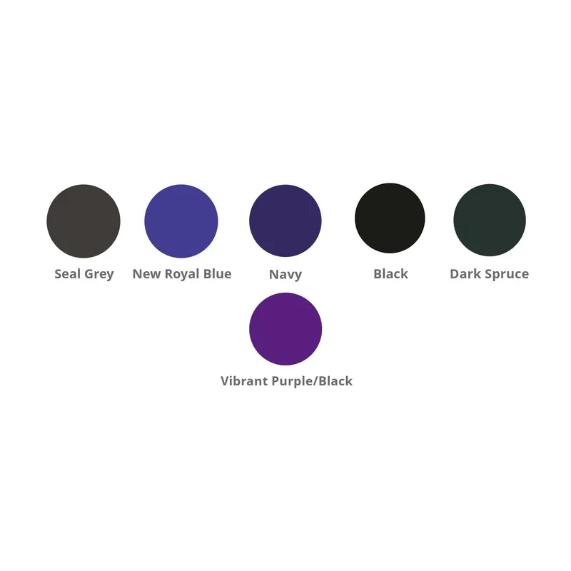 - Vibrant purple/black has white zip.