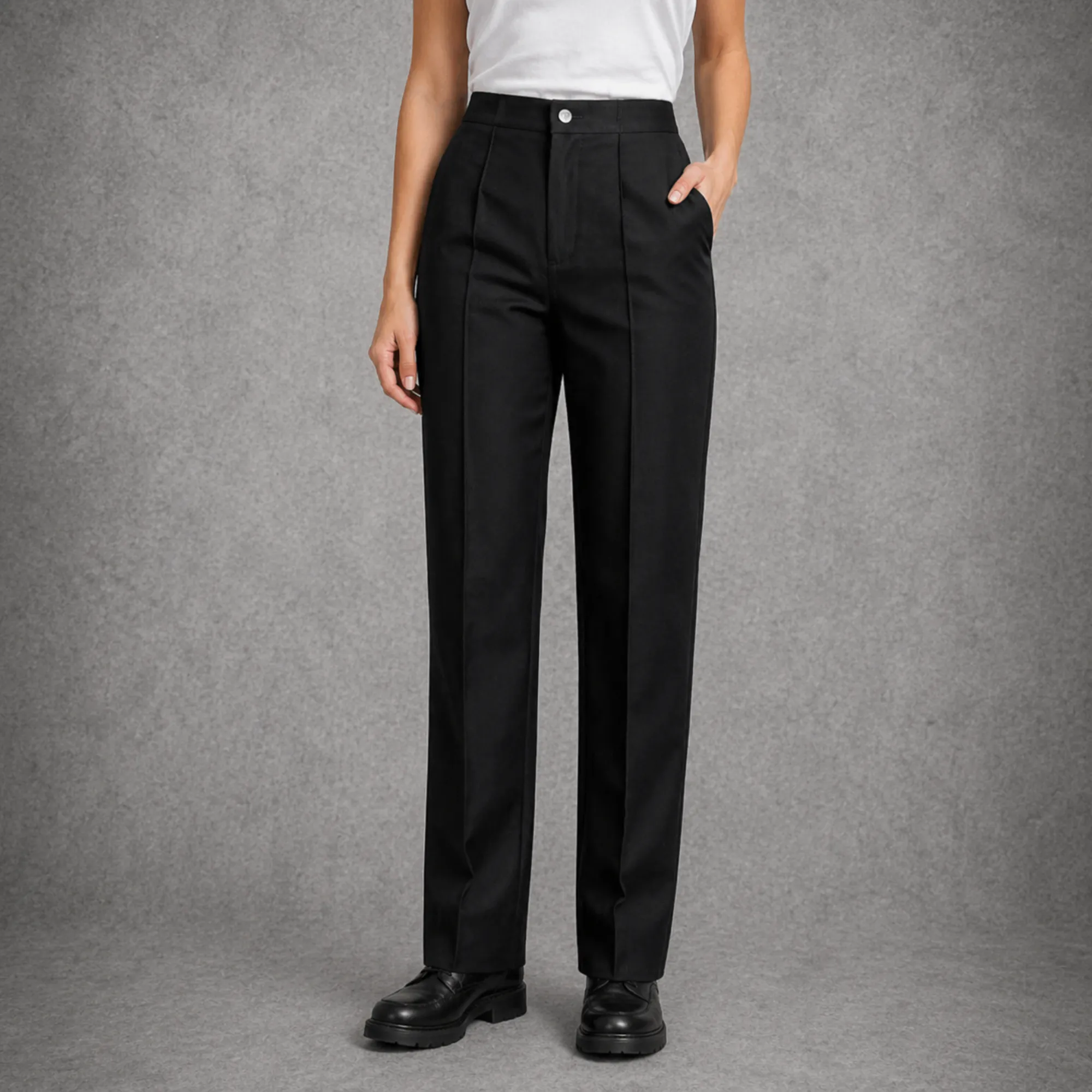 Women’s flat front trousers with sewn-in creases to give a professional look. Suitable for all working environments. Feature an elasticated waistband for extra comfort and zip fly with hook and bar. Available in a variety of colours.